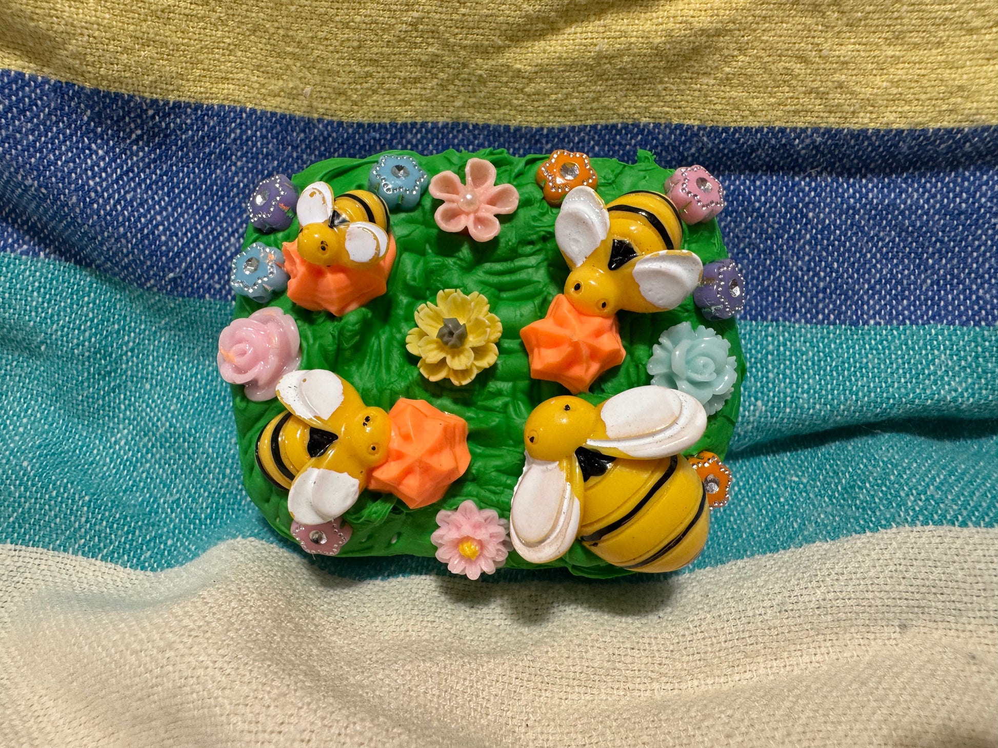 This 2“ x 2 1/2“ tin box contains mints and is adorn with devident art. This piece is called yummy treats. It is a one of a kind, but a custom order can be made to match closely.