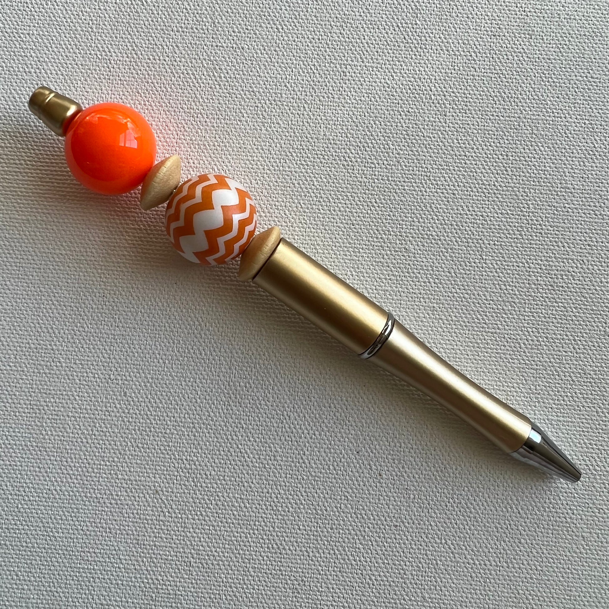 This is a plastic cased medium ball point pen with black ink. Topped with two fall colored bubblegum beads and two wooden spacer beads. Add a charm pack to this pen for a sparkly pizzazz. (Simple charm pack shown)