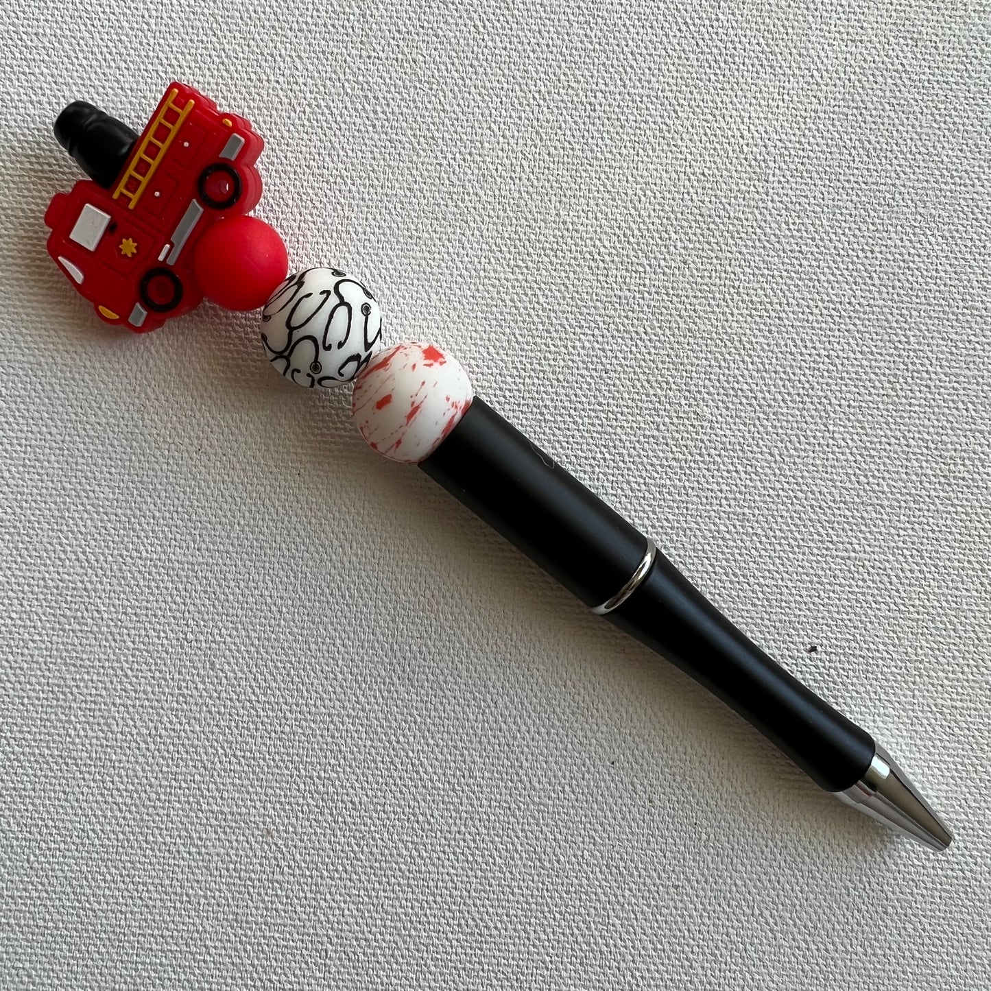 This is a plastic cased medium ball point pen with black ink. Topped with a silicone Fire Engine focal bead and three spacer beads. Make this pen your own with a personalized charm pack. (Sample charm pack shown)