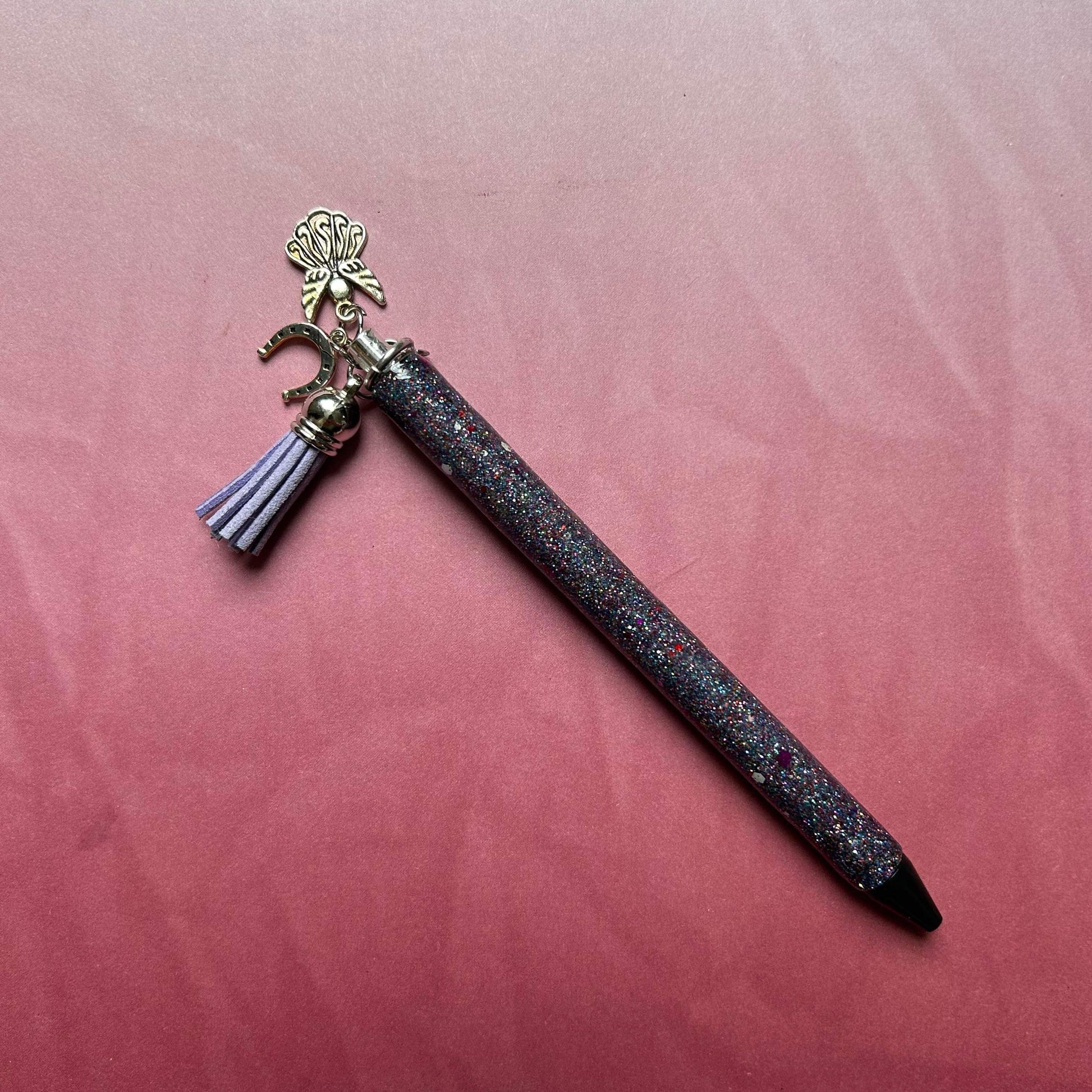 This is a black med ball point pen covered with a blue, purple, pink mixed glitter sealed in Epoxy for durability. These pens can be great conversation pieces by adding one of our charm packs to personalize it. (Sample charm pack shown)