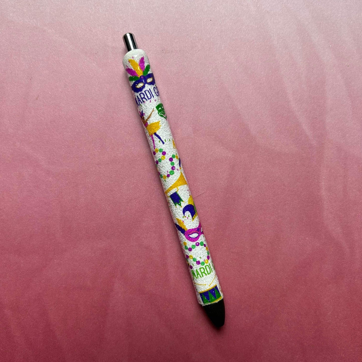 This is a black med ball point pen glittered in white, covered with a clear cast pen wrap and sealed in Epoxy for durability. These pens can be great conversation pieces by adding one of our charm packs to personalize it. (Sample charm pack shown)
