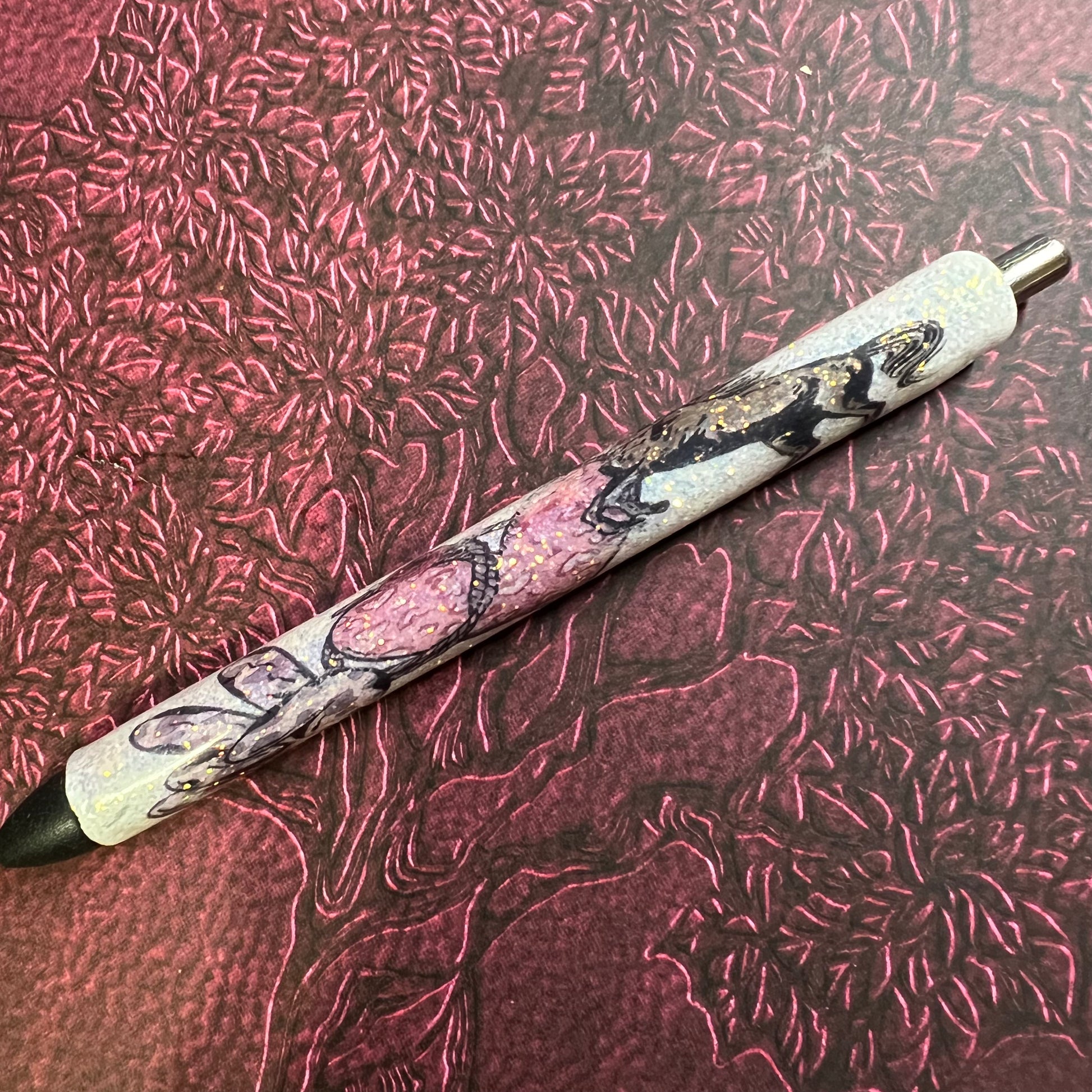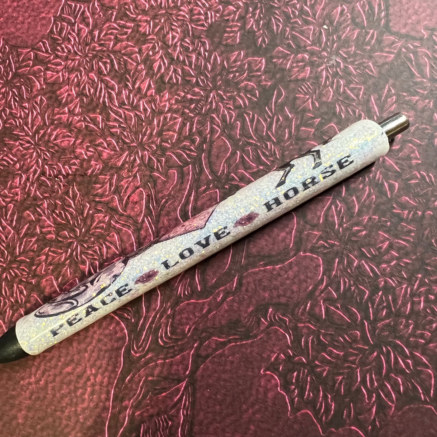 This is a Black-based medium ballpoint pen topped with white glitter, and wrapped with peace love and horse pen wrap. This pen is a bit chunky. For those with arthritis, this pain is comfortable to hold.
