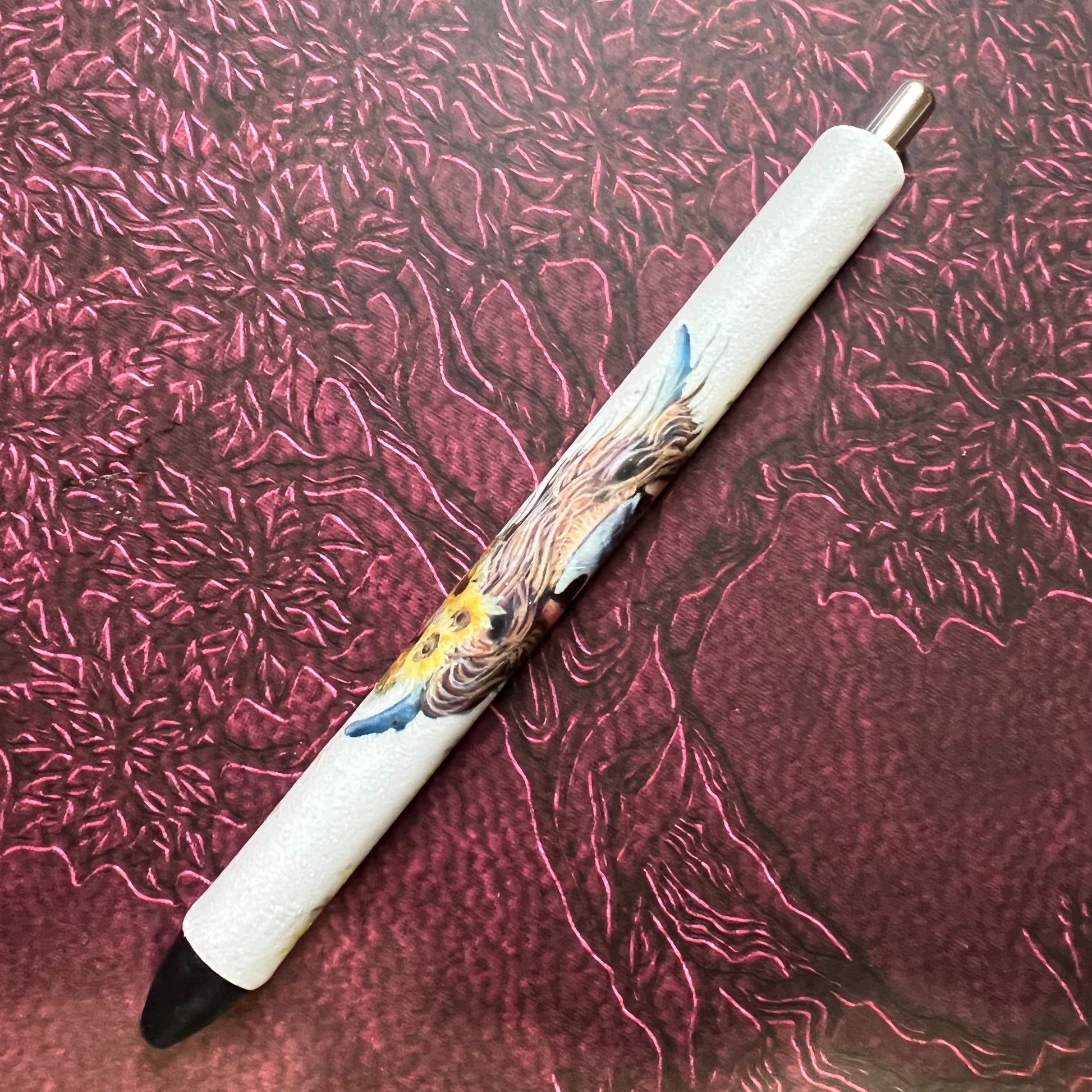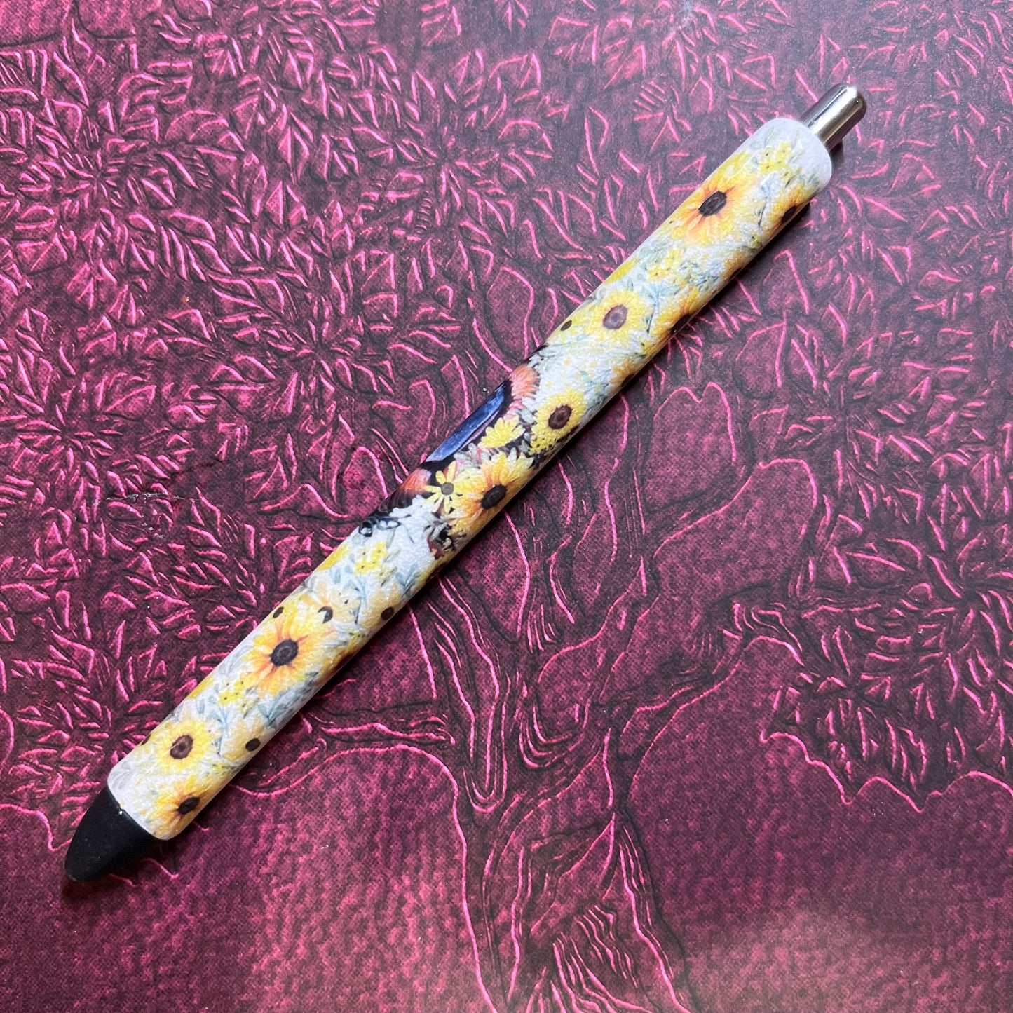 This is a medium ballpoint pen, black ink, topped with a highland cow sunflower layered with epoxy for durability and longevity.