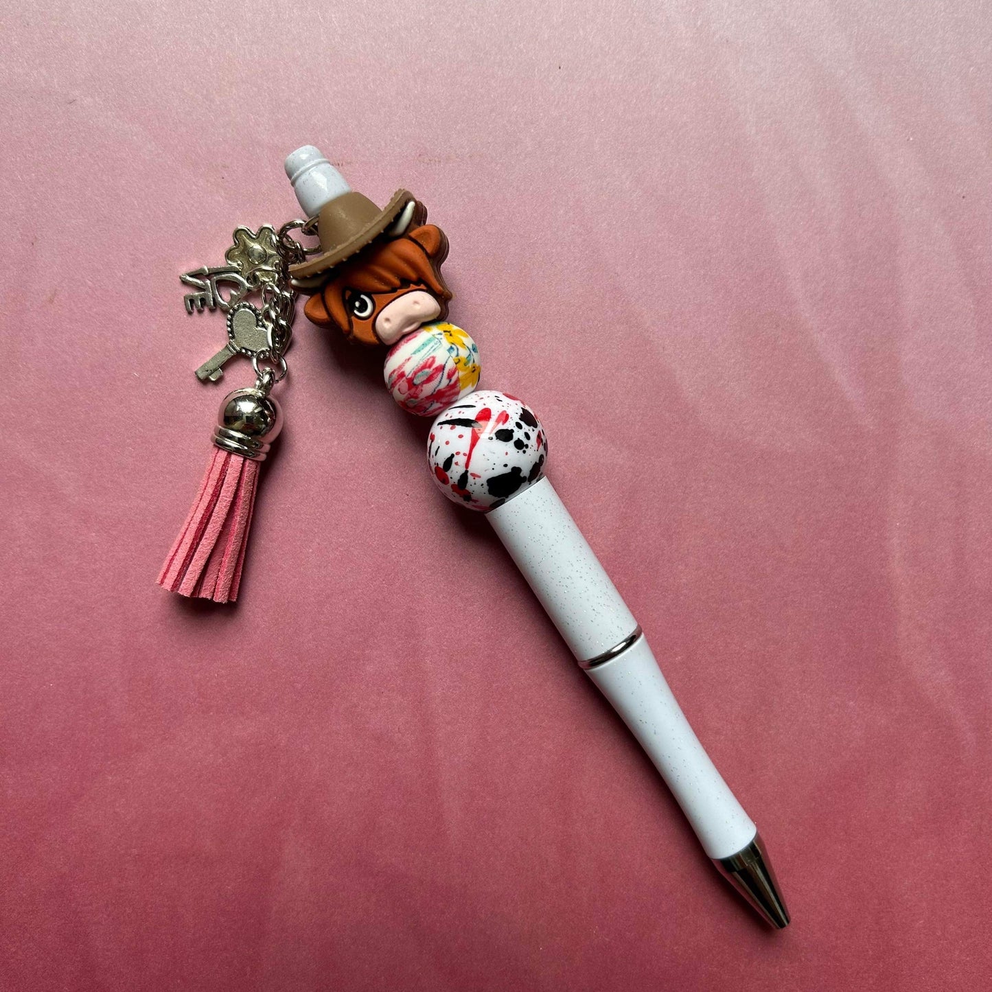 This is a plastic cased medium ball point pen with black ink. Topped with a silicone Hyland Cow focal bead and two spacer beads. Personalize with a “lovely “ charm packs and pink tassel. Available without charm pack as well.
