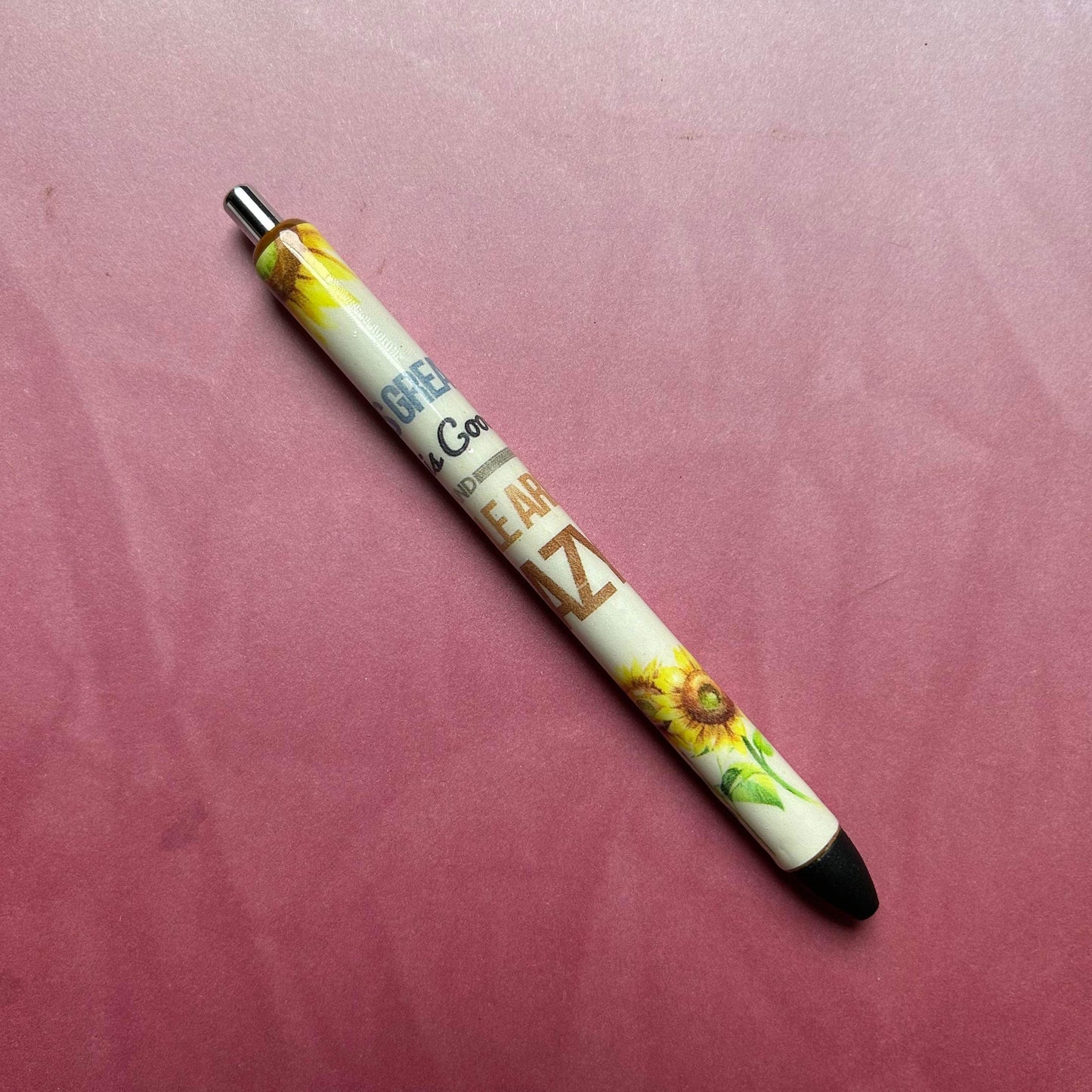This is a black med ball point pen covered with a white cast pen wrap and sealed in Epoxy for durability. These pens can be great conversation pieces buy adding a charm pack to personalize it and make it your own. (Sample charm pack shown)