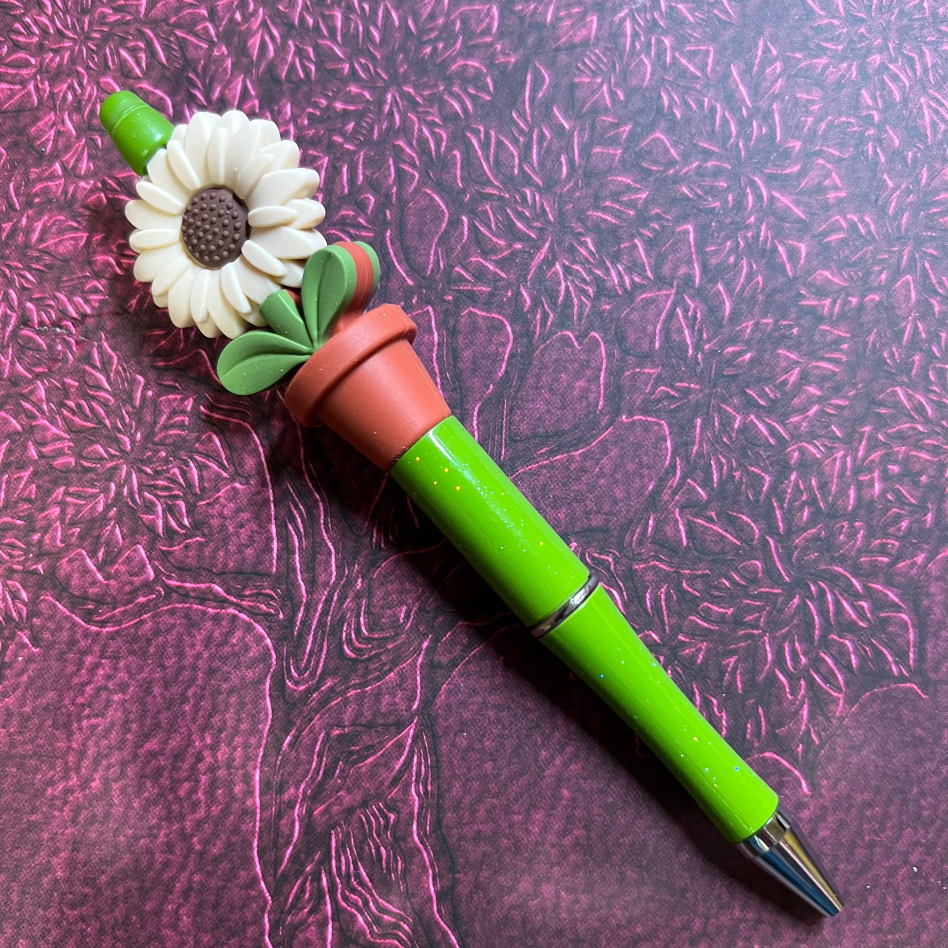 This is a beaded pen, topped with a beige sunflower and terra-cotta pot on a bright green base ballpoint pen.